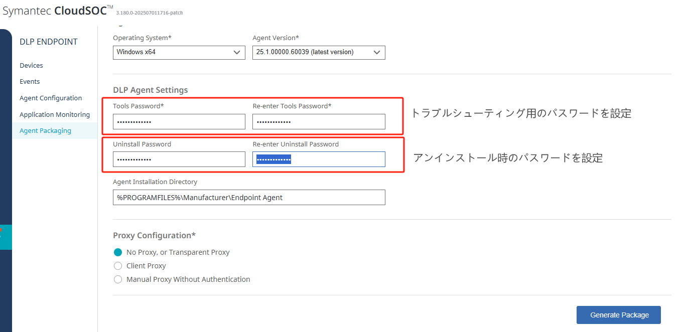- 以下のようにパスワードを設定して、[Generate Package]をクリックして、インストールパッケージを作成する