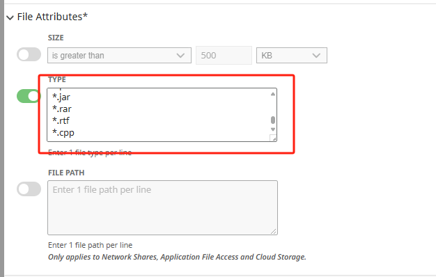 - [File Attributes]で審査したいファイルの拡張子を追加するか、OFFにして、すべての拡張子のファイルを審査します