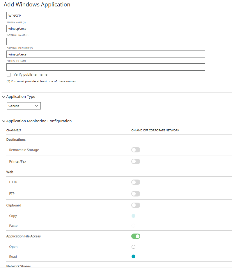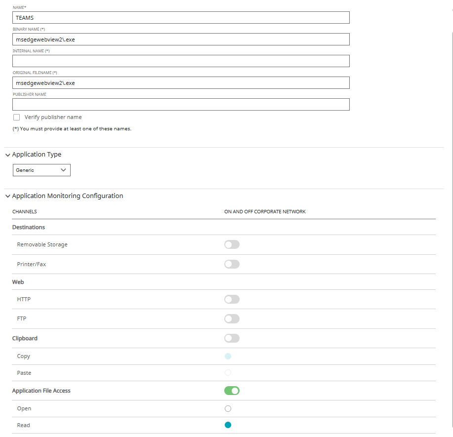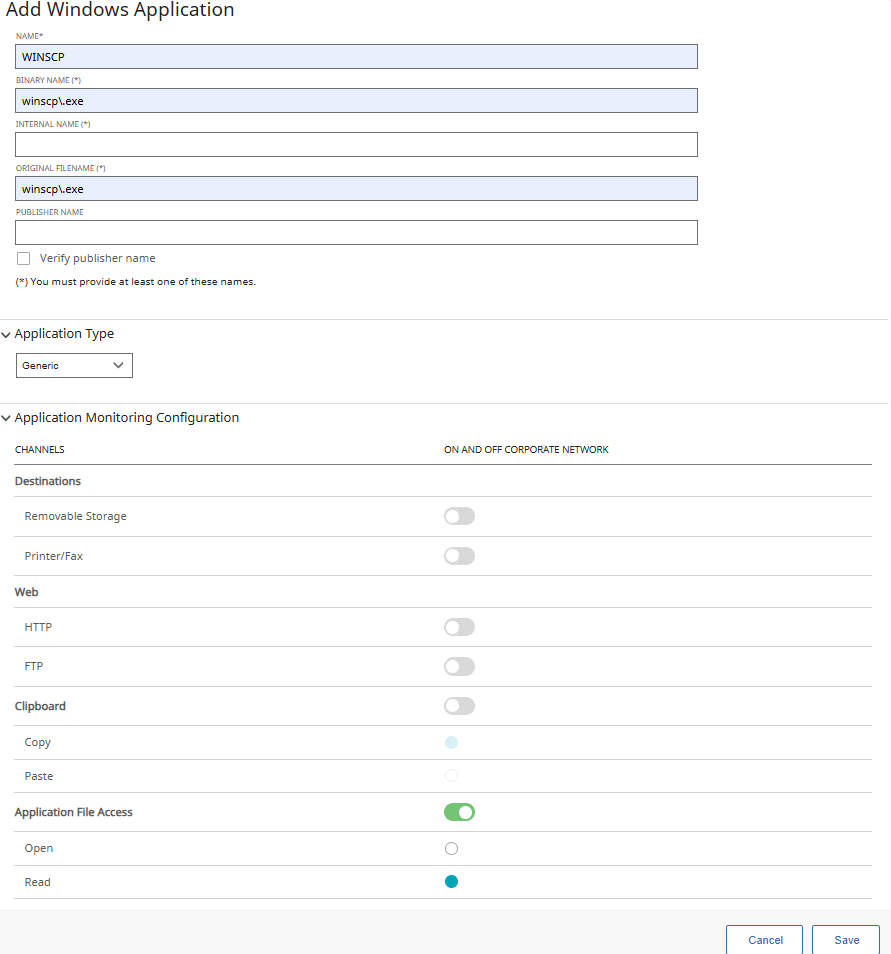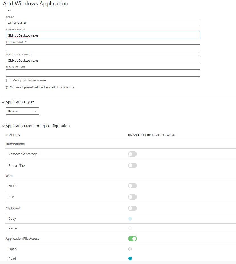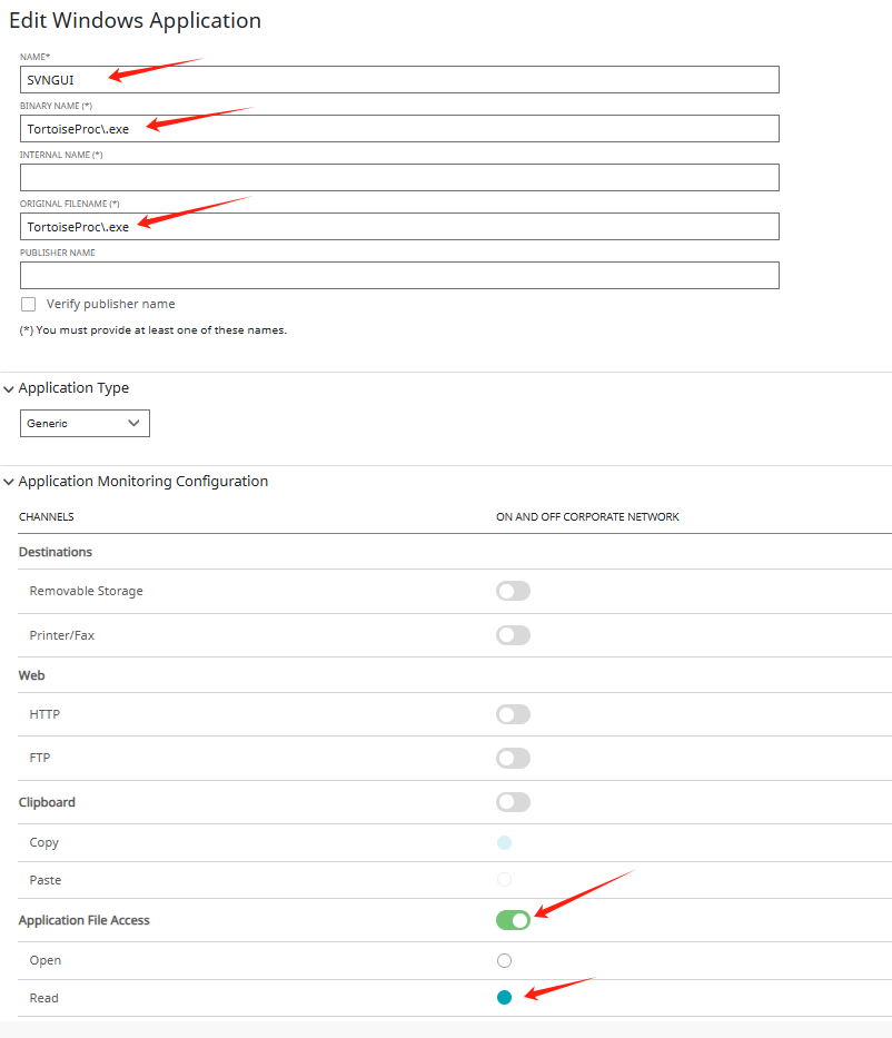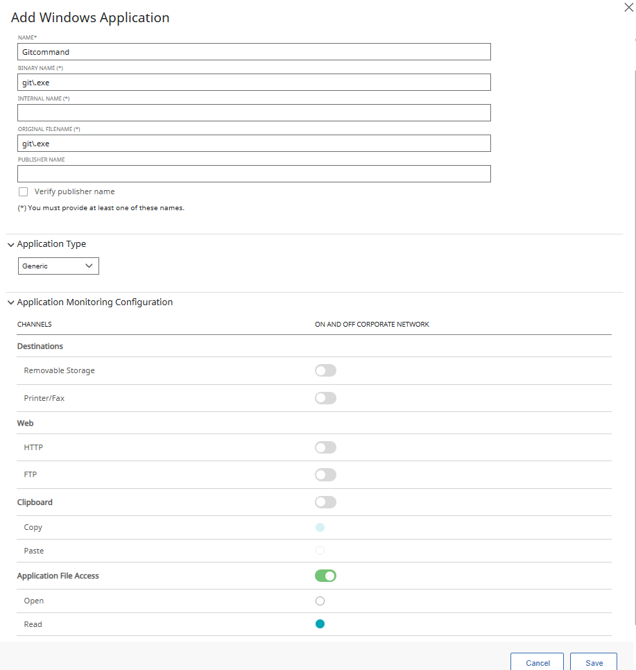 - 名前を付けて、実行プロセスのexeの前に\を付けて設定します。[Application File Access ]の(Read)だけにOnにし、ほかはOffにします